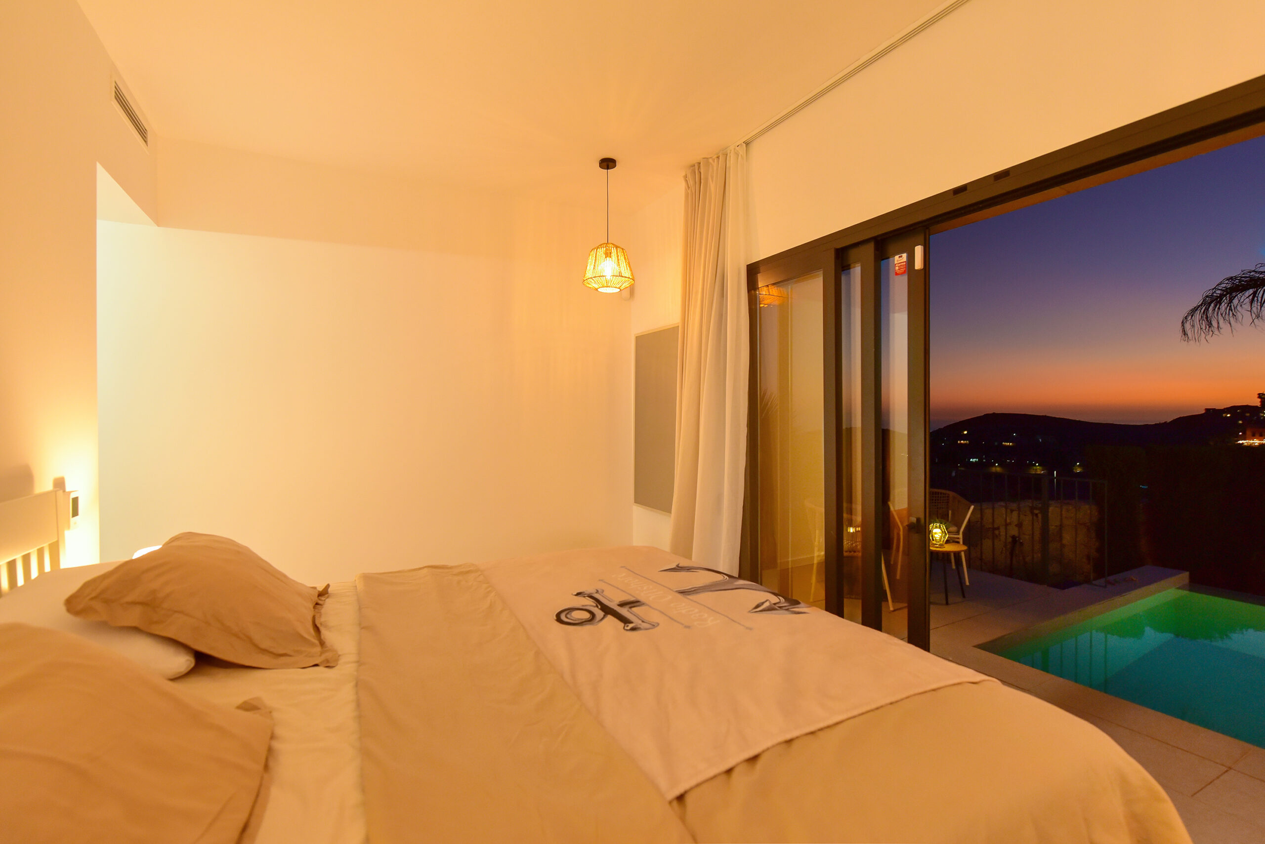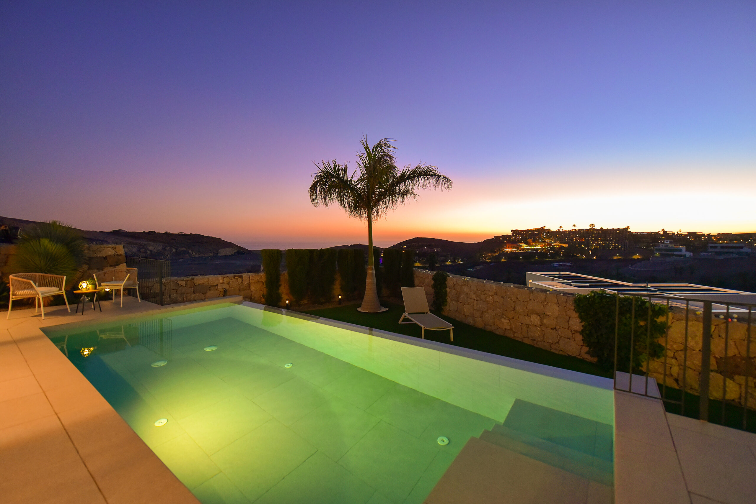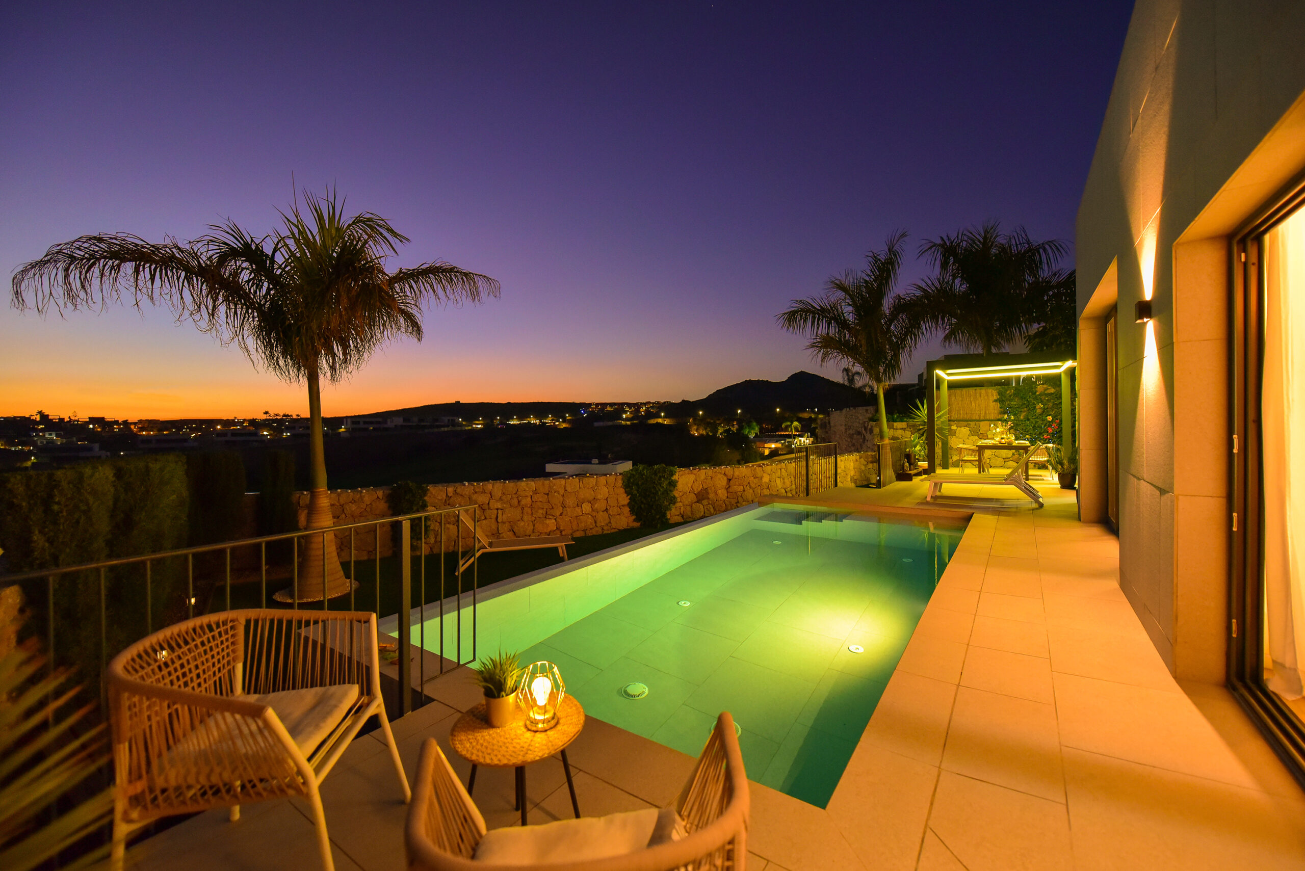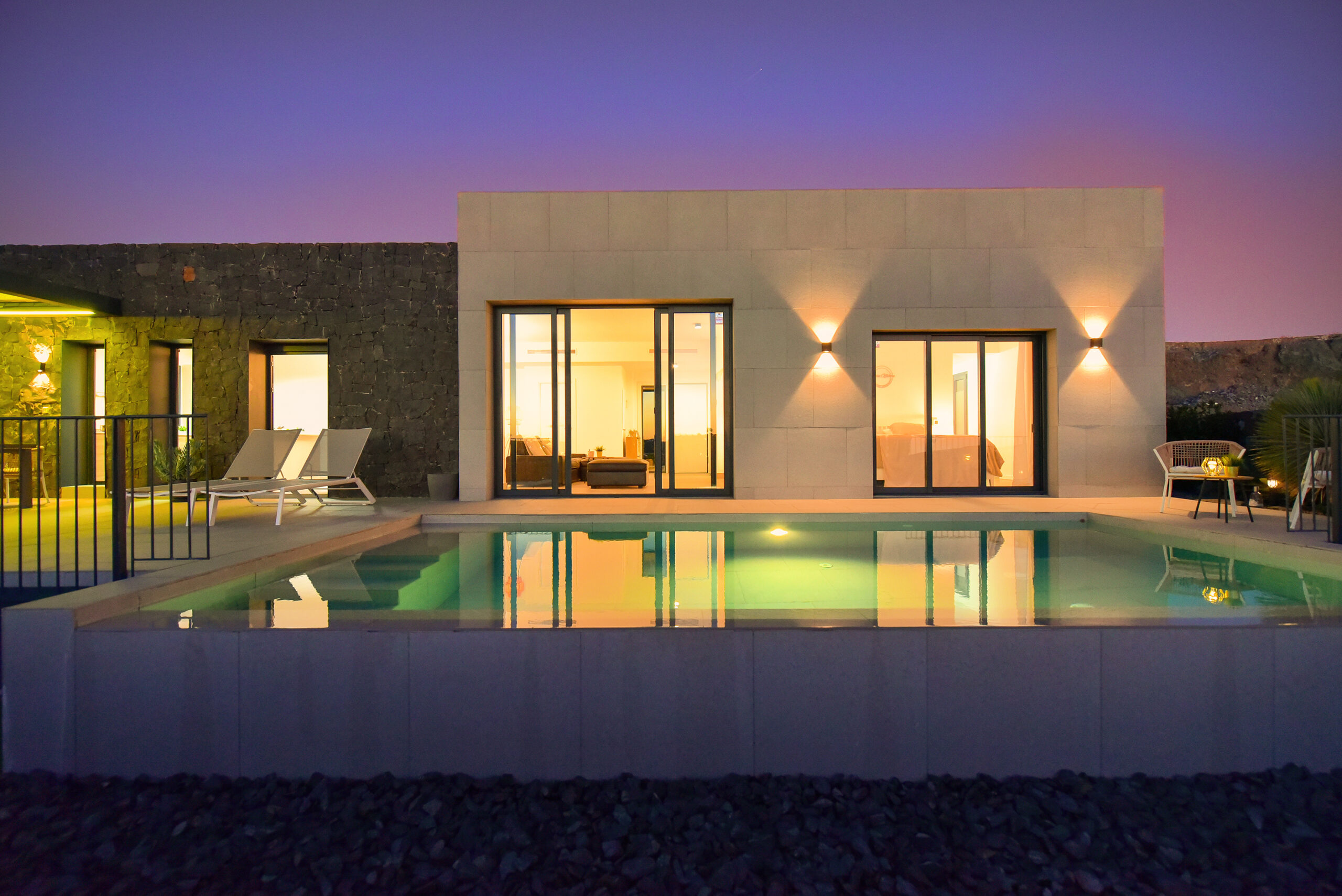 Wenn es dunkel wird, wirkt die Villa besonders: Licht, Wasser und Lounge-Bereiche sorgen für „Urlaub-bei-Nacht“-Feeling.